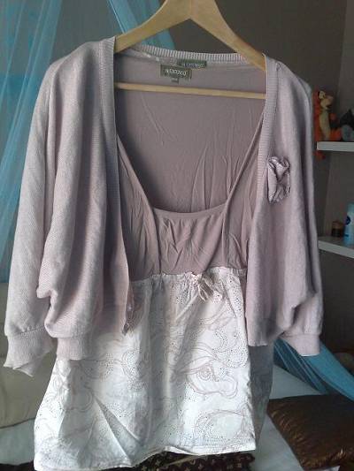 petit haut rose ancien au niveau de la poitrine et fleuri blanc et rose ancien vers le bas, avec son boléro, de la meme couleur , demi bras, et sa petite fleur sur le coté!