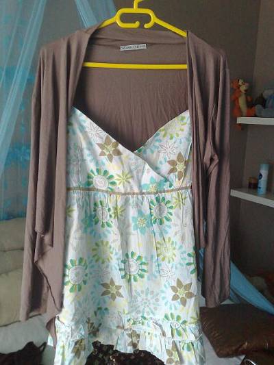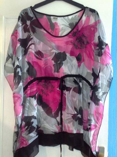Trés belle tunique transparante rose, noire et blanche, qui se sert en dessous de la poitrine, trés belles manches (que je ne saurais pas vraiment expliqué) mais trés mode!!!