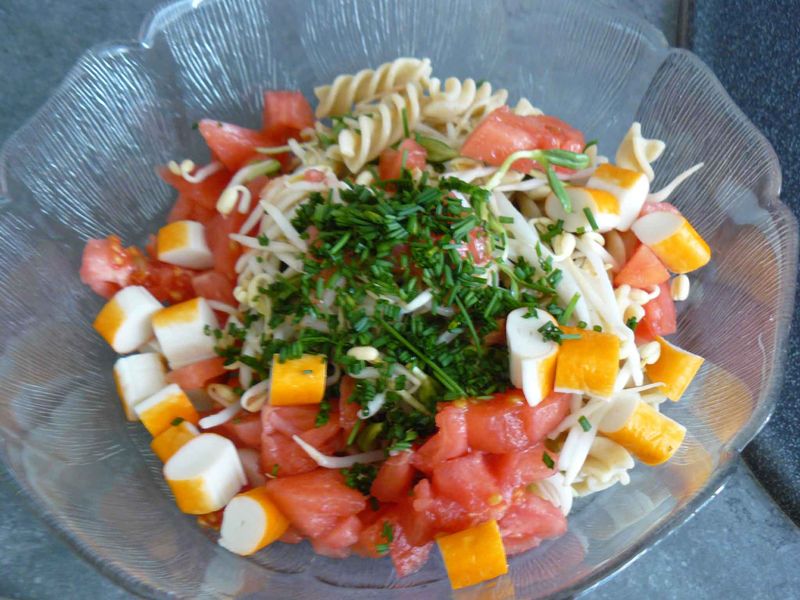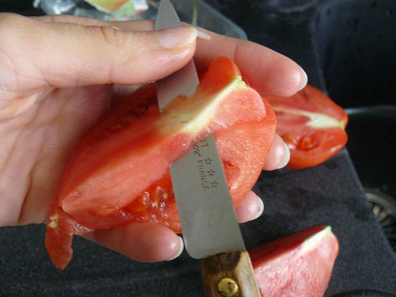 Salade de tomates rondes avec des petits dés de poivrons rouge cueilli de ce matin non, pas dans mon jardin, de piment végétarien, de cives, d'estragon, d'herbe à fer, et de truite fumé , avec une banane plantain cuite au four.