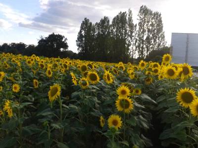Pas de champ de tournesols chez nous non plus. Mai du blé, de l'avoine, du maÏs et de l'herbe. On voit ici et la des champs de petits pois et de luzerne et autre mélange. On m"a dit que çà se bat et que c'est très bon pour les animaux.