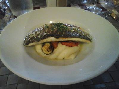 Dos de Cabillaud, servi sur un lit de purée de pommes de terre.& légumes de saison