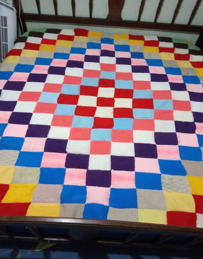 Bonjour mes amies Je vous montre le travail de mon dimanche : terminer la couverture. J'aime bien le résultat ,c'est pas parce que c'est pour des sans abris que ça doit être moche. En fait je fais en premier un modèle papier et je donne la laine qu'on tricote. Merci ,Monange pour le petit déjeuner . tu vas pouvoir te reposer c'est bien . On va me livrer du bois ce matin alors je vais avoir du travail pour le rentrer. Ma fille tricote aussi elle veut de la laine grise je vais devoir aller au grenier mais c'est pas grave, elle arrive le 24 . Les deux couvertures vont partir à Orthez car c'est là bas qu'ils en ont le plus besoin. Une amie tricote des bonnets et nous ferons aussi des tour de cou . Il pluvine ce matin mais pas froid. Je vous souhaite chacune une bonne journée et une bonne semaine Pierrette