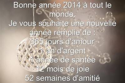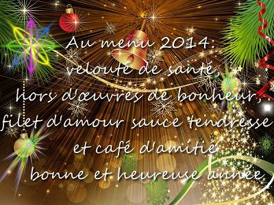 Je vous souhaite une bonne année 2014 quelle vous apporte la joie, bonheur et surtout la santé.
