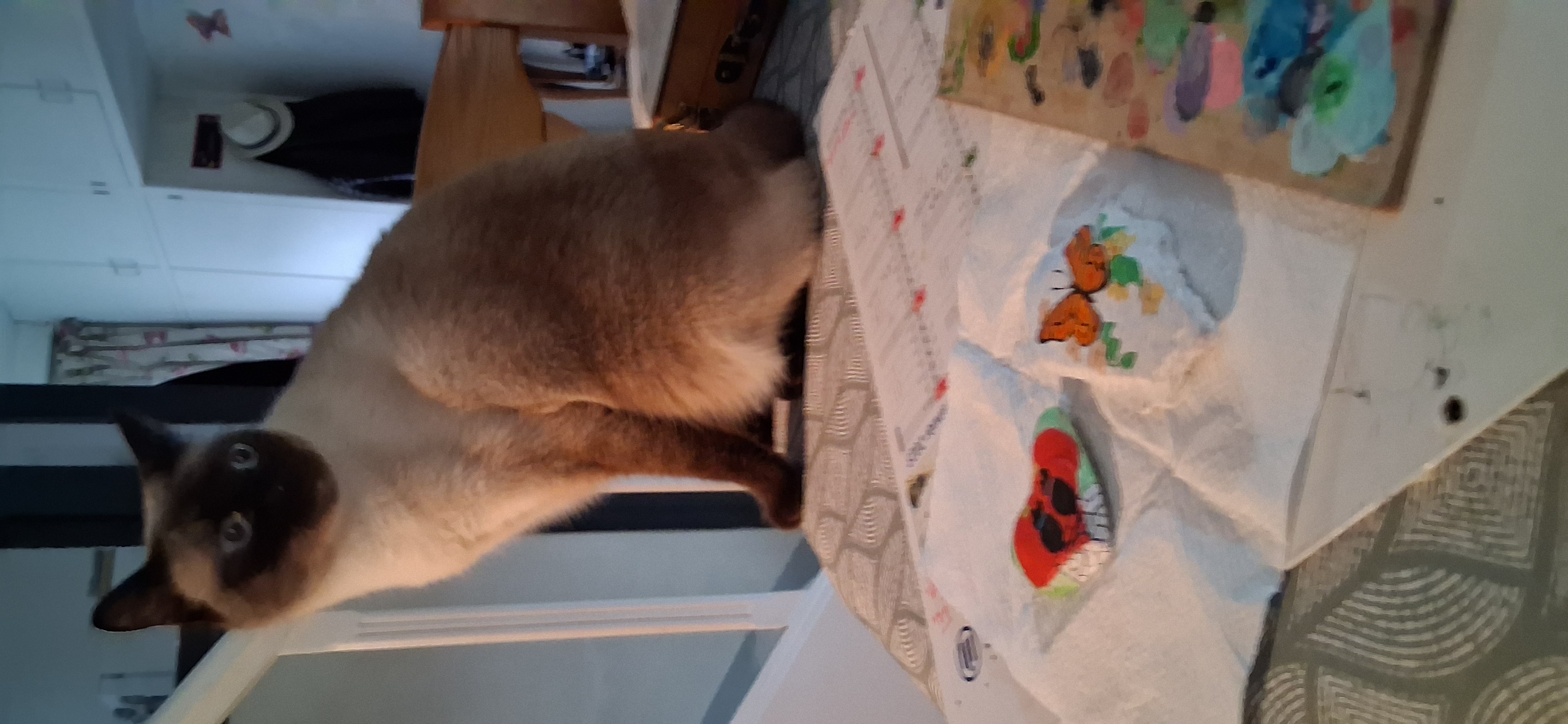 Photo de cet ap’midi, Trésor  qui me tiens compagnie quand je peinds mes galets.