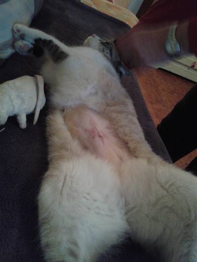 Elle cicatrise bien , c'est propre, elle fait la difficile sur sa pitance !!! mais ça c'était courru d'avance!! elle va du lit au canapé et du canapé au lit.... et nargue sa collégue au passage ..... une vraie fille quoi ! |