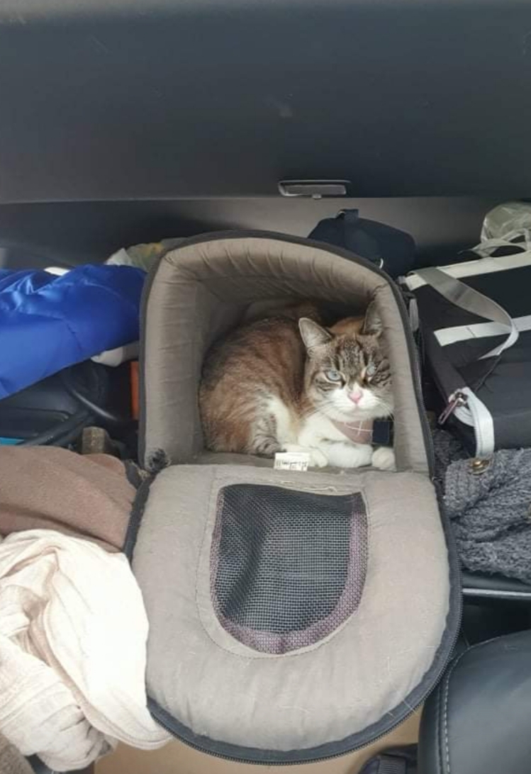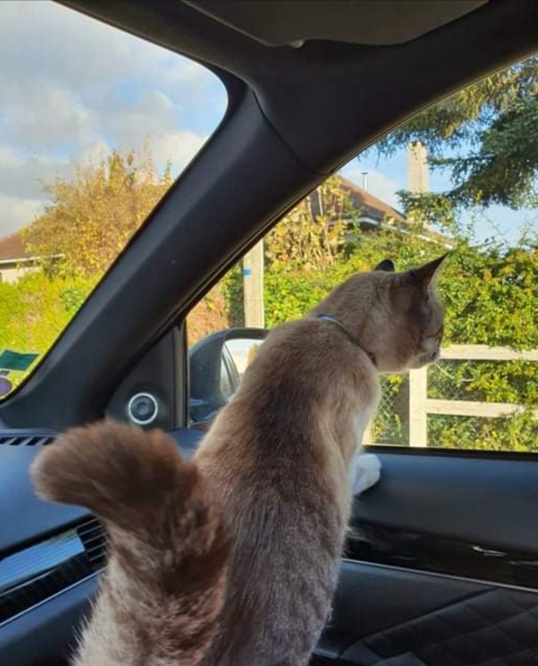 la pauvre, elle n'a vraiment pas l'air contente. Est-ce l'absence de Bouchon qui la rend triste, ou bien être coincée dans la voiture à avaler des km et ne pas pouvoir gambader à son aise ? |