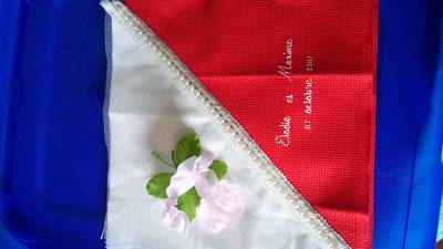 a l'envers bizarre bizarre !!! je ressaie de vous mettre une photo du coussin d'alliance pour ma petite voisine avant de terminer il reste les rubans a fixer pour attacher les alliances mais je voulais lui montrer si ça lui plaisait elle est ravie |