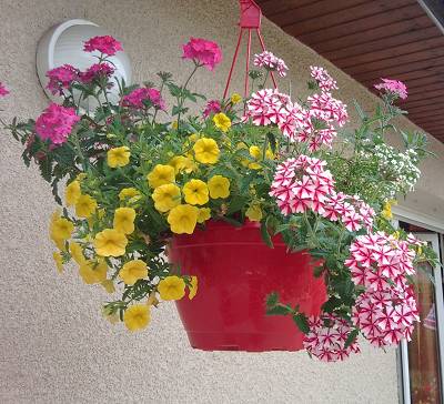 BWA magnifique ton chat botté, j'admire le travail. Super si votre Mamie peut être déplâtrée, même avec de la rééducation, elle se sentira soulagée. Les petites fleurs dans les géraniums sont des Kalibrachoas (comme des minis pétunias, mais qui ne poissent pas, et quand les pétales se fannent, ils tombent tout seuls, c'est quasiment auto-nettoyant) et ça fleurit sans arrêt. j'en ai mis plein partout comme tu pourras juger : suspension, bacs