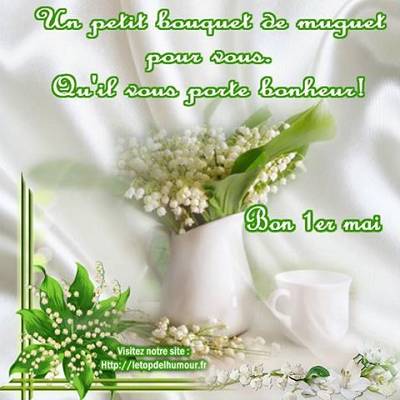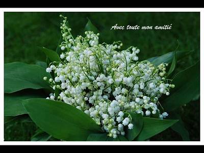 Bonjour à toutes, Je vous offre à toutes ce muguet qui j'espère vous porte-bonheur et surtout à notre petit Yoan. Floreline belle photo de cette magnifique et courageuse famille, je leur souhaite que tout se passe bien, pense bien à vous. Belle journée hier malgré le vent Gigi bon courage pour la voiture balai Nouche oui j'ai pensé à Robert il ne lui fera pas de mal Pat chez toi aussi pas aujourd'hui le transat ............... je vous souhaite à tutes un bon 1er Mai |