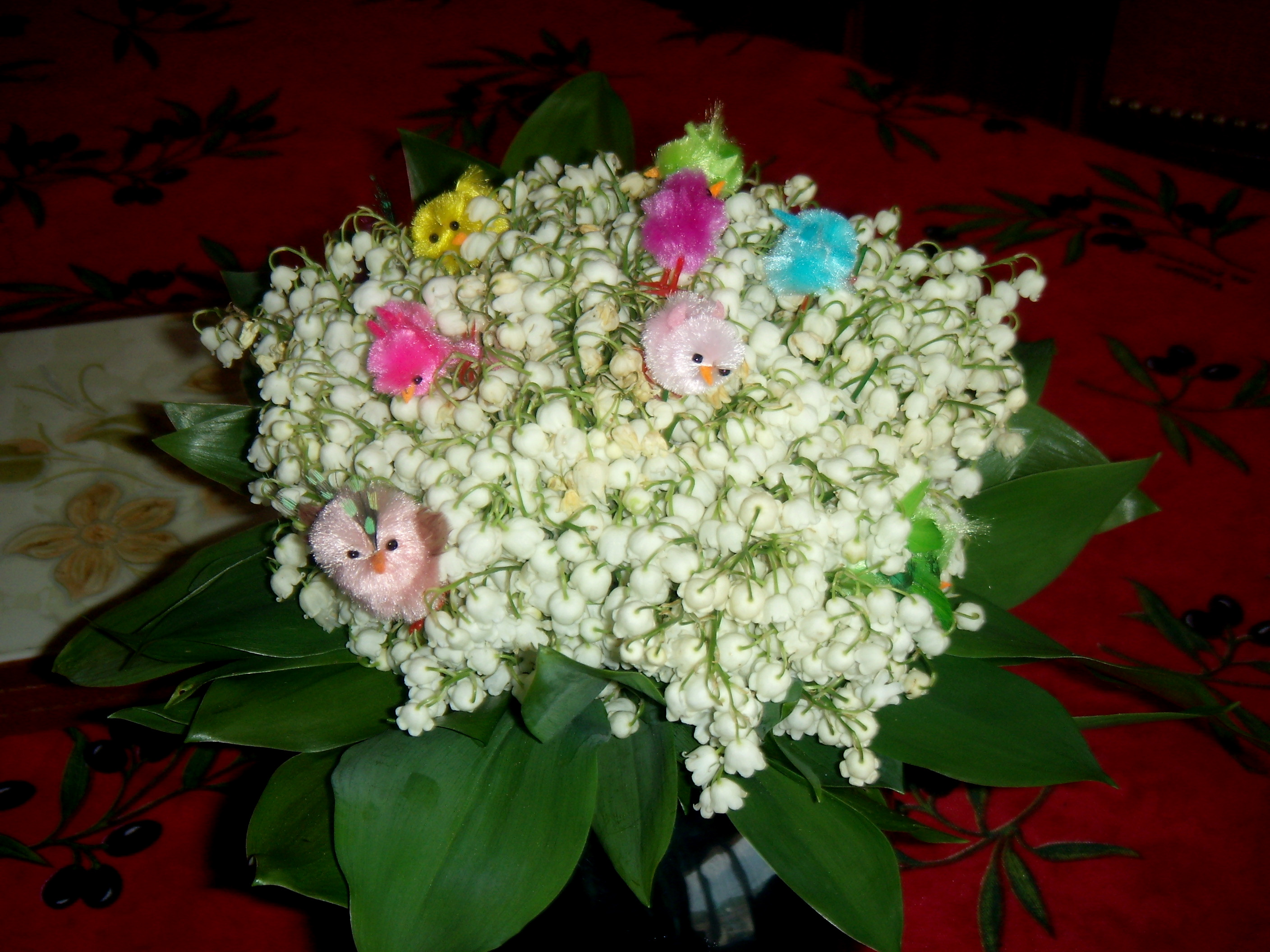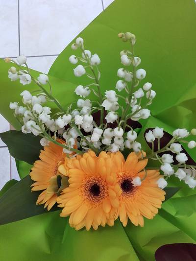coucou les maminettes eh bien surprise ce matin au reveil temps gris et pluvieux ,il faiudrait presque que l'on allume les lustres pour voir ,chaque annnée on va faire un petit tour au bois c'est pas loin de chez nous et on monte dans le bois en voiture sur le chemin strategique de là on s'enfonce un peu a pied mais vu le temps on se contentera du muguet qui pousse dans le jardin mais bizarrement en principe le muguet troche mais là il a pousse comme on l'a planté il y a quelques années robert s'en etait debarrassé car il envahissait le jardin là quelques brins ça et là ,on s'en contentera robert vous remercie toutes pour vos voeux de bonne fete ,des fleurs qu'il adore et du beau gateau de coco au moins celui là a t'il dit il ne fera pas monter ma glycémie floreline effectivement belle photo de tes enfants et petits enfants esperons de tout coeur que la greffe va réussir c'est notre voeux le plus cher a toutes bwa j'ai montre ton rhodo a robert il dit qu'il faut chaque année que tu creuse tout autour et un apport en masse de terre de bruyère lui ferait du bien c'est ce qu'il a fait pour notre hortensia mais plusieyrs années ont ete necessaire pour arriver au stade de l'an passsé cette année bien sur il va etre toseler ça me rend malade de le voir ainsi mais il est fort de 60 ans au moins il sera comme les phenix il va renaitre encore plus beau il faut y croire gigi bon courage pour la voiture balai tu ramasse les trainards et les eclopés ?? enfin ça va te faire du bien de t'evader un peu car quand on est dans les travaux comme ceux que vous avez entreprit on en voit generalement bien la fin ,enfin tu auras une maison toute neuve hier mon repas a bien plue il en reste un peu ce sera pour ma grande pret deja dans un tupperwarre ce jour je ne sais pas trop quoi faire il faut que je reflechisse et fasse un tour au congel peut etre de la lague de boeuf c'est un repas qui se prete au temps je n'ai pas de navets mais bon carottes poireaux patates ça devrait suffire on verra !!! bonne journée les filles je vais essayer de vous envoyer un bouquet de muguet ceuillis par nos mains dans les bois de faulx l'an passé |