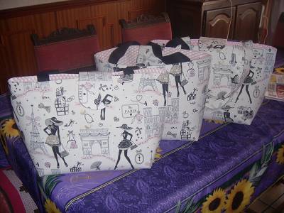 coucou les filles encore bien travaille cet aprem un sac de terminer coco pour repondre a ta question pour le tissus paris il existe fond blanc rose ou beige chez mondial tissus et aussi eurodif c'est en 140 a eurodif et en 150 chez mondial plus interressant chez mondial car avec un metre on peut en faire 3 a condition d'acheter de la sangle noire pour 2 sacs on ne peut faire des anses que pour 1 sac quand a la viseline il faut en prendre de l'assez epaisse car tisss assez leger les vendeuses m'ont dit que c'est un tissus qui a remporte un tres grand succes idem avec 1,50 en 90cm tu en as pour 4 sacs a part ça les filles il a plu toute la journée il fait frisquet ,qui a dit c'est le printemps ??? gros bisous et bonne soirée |