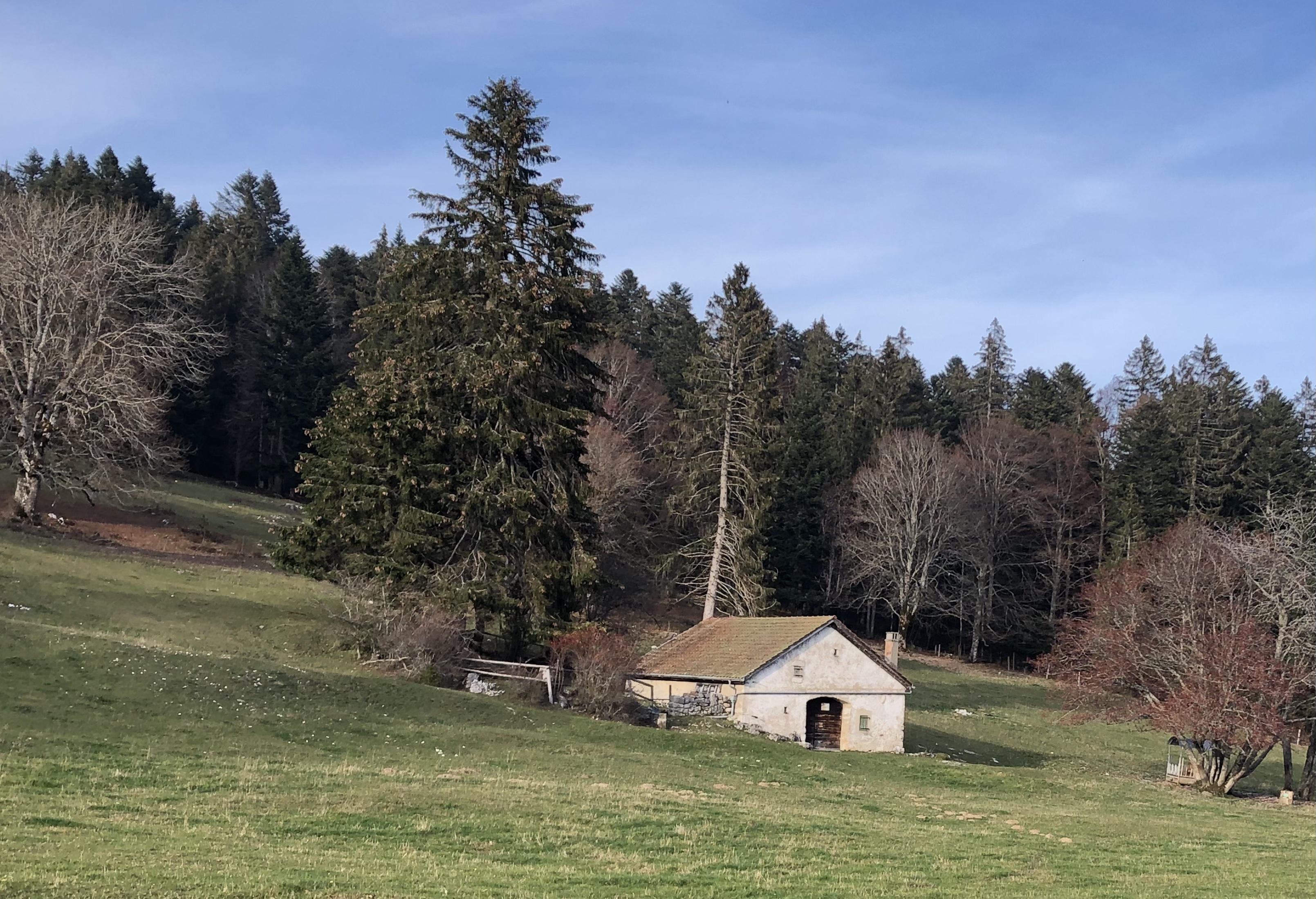 Photo, si elle passe, Chez nous les étables du Jura neuchâtelois s'appelle des loges, en voici une où l'on a eu passé des weekends avec mes parents quand j'étais toute petite. Une toute petite pièce était aménagée pour y passer la nuit. (Ça date de la dernière guerre)
