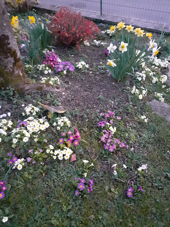 Bonjour, ciel laiteux, mais soleil pas loin, et grande douceur dans l'air.... La lessive de "noir" a séché vite hier. La bibliothèque étant fermée aujourd'hui, j'ai dû y aller hier, et en même temps ai débarrassé des choses à Emmaüs, puis un tour à Top office pour de l'encre imprimante..... pas donnée maintenant ! Du coup un tour à Cultura juste à côté pour une carte de la côte d'Azur, et un petit guide, puis finalement j'ai atterri dans un magasin de chaussures juste à côté, (initialement simplement pour voir... GIGI à nouveau mal en point avec la glu, une vraie calamité. En ce qui concerne mes fleurs, ce n'est qu'un petit coin, tout le talus est fleuri, les tulipes s'y mettent aussi, avec mon cerisier. De belles photos avec mon appareil, mais hélas, pas pu les enregistrer MARTINE, ta forme revient de mieux en mieux, c'est super. J'ai osé Gertrude ce matin !!!! bonne surprise, mais je remarque que depuis 1 semaine au moins je n'ai pas mangé de fromage, surtout du Comté, car pas acheté, et pas non plus de biscuits avec le thé de 4 h....MANA reprise des habitudes au Baraka, avec le soleil cela fait du bien......NOUCHE encore des agrafes en moins, la cicatrice tirera moins, malgré tout, prends ton temps pour récupérer.....DIDINE un tour chez le caniche pour toi et le véto pour Hindie, chacun son truc. Pour le reste d'accord avec toi, dans certains cas irrécupérables, il vaut mieux être comme on est toutes les deux...seules. COCO chouette, petite cure tranquille et au retour arrivée de Sandrine pour quelques jours, tu vas être aux anges. Bonne journée à toutes. |