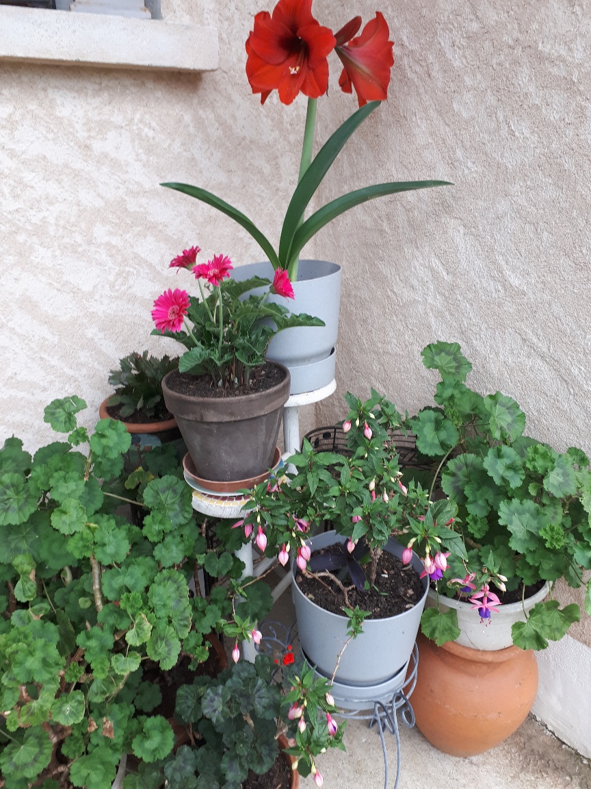 Re coucou ! pluie sans discontinuer depuis ce matin. COCO je ris PAT, pour l'instant, je laisse les géraniums sous le porche, mais dès que j'aurais passé le karcher, ils rejoindront leur place le long de la terrasse, et dans la rocaille, ne restera ici que le fushia, l'amarylis, le gerbera (qu' Axelle a baptisé: vomito Ah on sonne, bonne fin de journée, bises |