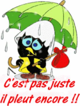 BONJOUR LES FILLES Que d'eau, que d'eau !!! sans interruption hier et probablement idem aujourd'hui, c'est désespérant Vu ce qu'il tombe et la diminuation de la vitesse que ça entraîne, je ne crois pas qu'André soit à l'heure à son rdv à l'hôpital A part ça, tout baigne !!!!! ben oui, l'eau monte au fond du jardin Ah téléphone.... bises