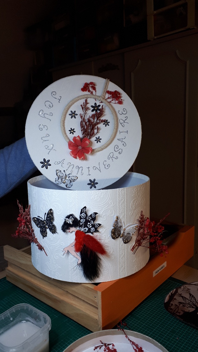 re- coucou, j'ai oublié de vous mettre l'image de la boîte, bon il manque encore quelques petites bricoles. je reviens de la déchèt', il a fait bien bon, 13° mais de vilain nuages s'annoncent à l'horizon..... allez une petite tisane au thym, bises |