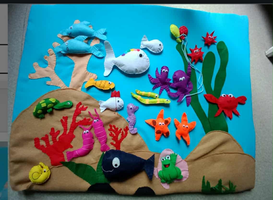Voici le fameux tapis à histoires, là c'est l'histoire du petit poisson blanc qui cherche sa maman, je ne fais pas tout en feutrine, j'en tricote pas mal |