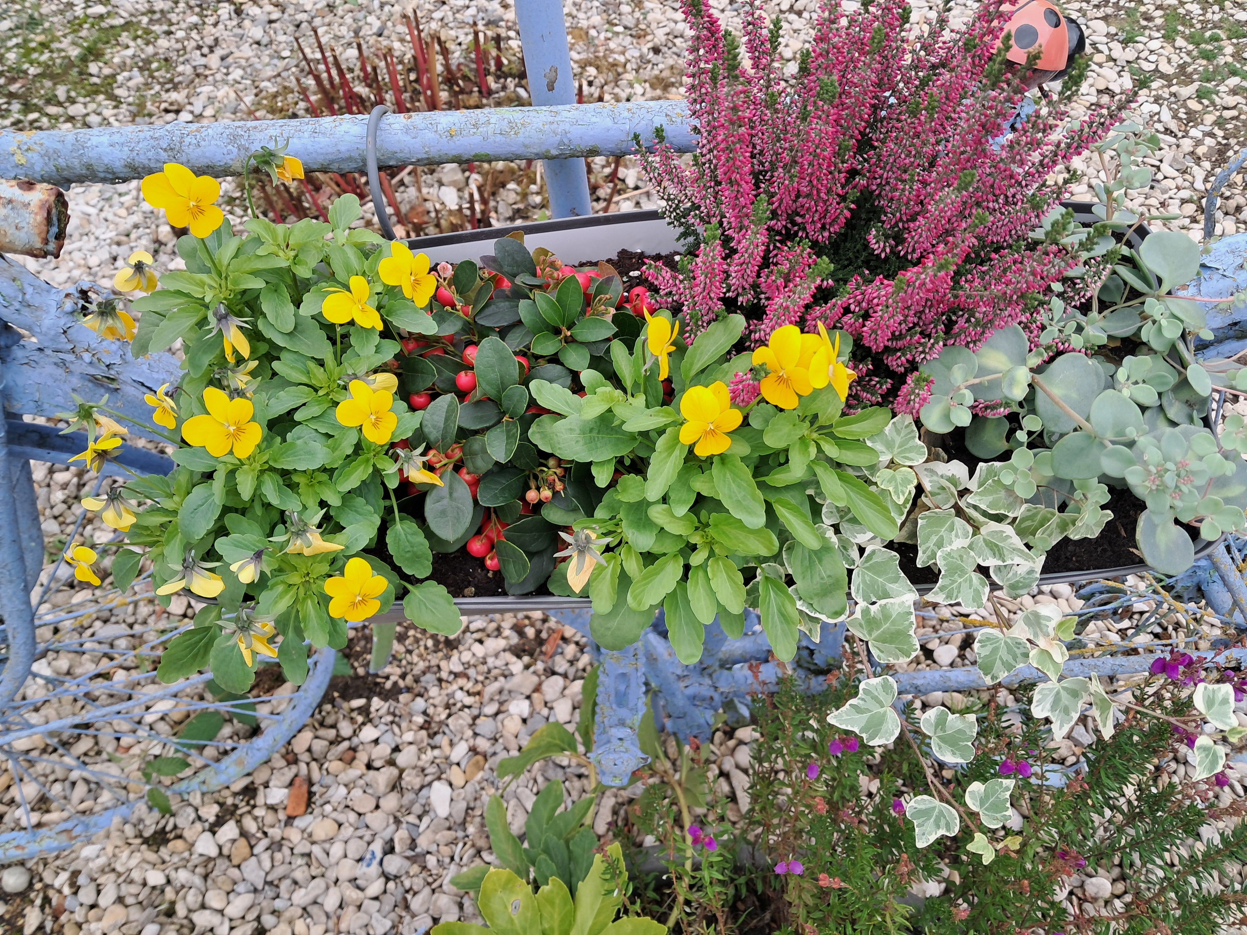 Bonjour les Filles, Temps gris et humide qui devrait s'améliorer un peu ce week end ; j'ai tout de même remis la chaudière en route, car 15° dans la maison c'était un peu juste, maintenant 18°, ça me va. Un peu flemmarde ce matin, Jeudi gym (courbatures) et hier kiné le matin, pour travail bras droit et dos !!! et un peu de vélo le soir !!! la kiné a trouvé que j'étais encore très souple, donc il faut entretenir. S'il ne pleut pas, je commencerai les travaux d'automne : mettre mes galets blancs à l'abri pour les préserver des salissures dues aux graines des oiseaux, vérifier l'état des mangeoires, le stock de graines, et tailler certains arbustes.... BWA en effet, très sympa l'attitude de ton marchand de peintures. SOLINE tracas avec la CB ; comme Martine, je n'achète rien sur internet, et ai fait supprimer mon compte bancaire en ligne, trop d'arnaques possibles. De toute façon, j'ai suffisamment d'endroits sur place pour faire mes achats, et mon agence bancaire est proche. MARTINE ce sera un ALDI le nouveau magasin, jusqu'à maintenant j'allais parfois à Lidl pas trop loin, bien concu, et approvisionné. LISE problème téléphonique résolu ? COCO ici aussi peinture prévue pour le petit guéridon vert que tu connais, sur la terrasse. Jolies jardinières et coupe. MANA temps pluvieux qui n'incite pas à la promenade, dommage. Bonne journée les minettes. Petit souvenir, dernière photo générale.