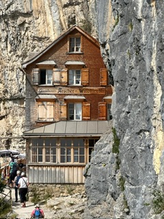 Bonjour les copinettes, Grsi gris ce matin, hier une très belle journée mais chaud chaud, ma virée journalière en fin d'aprem après que le soi disant orage ait passé. Comment te sens-tu aujourd'hui PACHTOU?. COCO, Etretat que de beaux souvenirs la première fois en suivant les côtes de Normandie juste apres les célébrations du quarantième anniversaire du département. Ca fait longtemps!!! Plus tard nous y sommes retournés avec le CampingCar au début facile de trouver un emplacement, plus tard exclu, Comme partout d'ailleurs. NOUCHE, pourquoi pas une séance ciné, bien au frais. DIDINE, merci pour ton petit dej. BWA, 38 deg, ce n'est vraiment pas suppportable, comme chez GIGI, qui fait bien d'enclencher la Clim la chaleur n'étant pas un bienfait pour tes migraines. MARTINE. Oui nous, mamies, sommes là quand il faut. Au moins on se sent utiles. LISE, plonge pour nous dans la mer, profite de ce bel endroit. Photo que m'a enoyée une amie en vacances danns le canton d'Appenzell, pour arriver dans ce resto il faut avoir le physique ça grimpe raide, au moins cela limite l'invasion des touristes. (Quoique il y a quelques années les amateurs de montagne ont envahi le lieu suite à une photo diffusée sur FaceBook) Il y a eu toute une polémique et le resto a fermé quelque temps, depuis cela est redevenu raisonnable. |