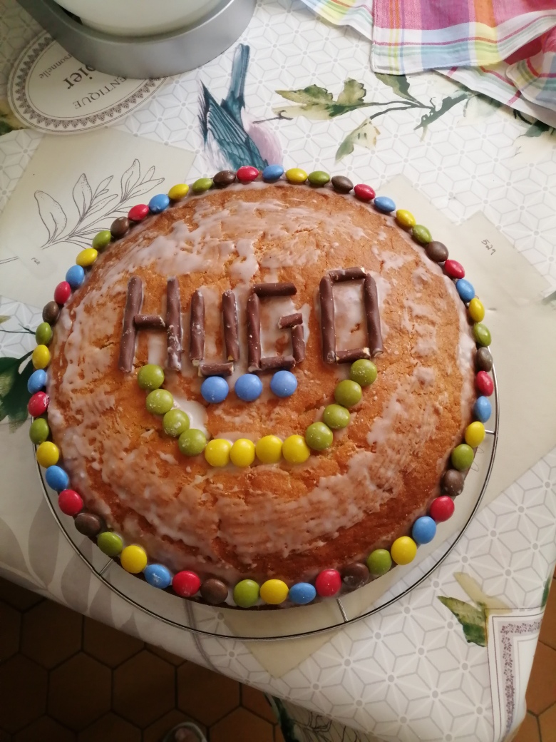 re si ça fonctionne voici la photo du gâteau d'hugo un simple gâteau au yaourt dans lequel j'ai mis des pépites de chocolat |