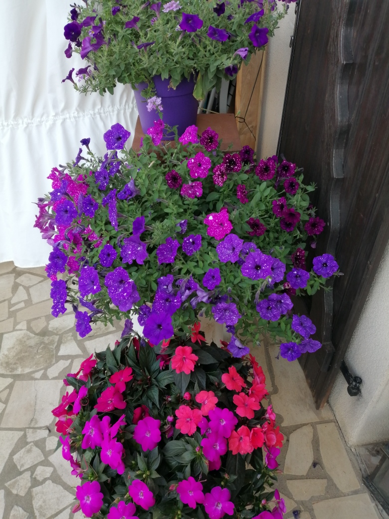 re pour donner de la couleur au forum ci joint la photo de mes petunias et sumpatients tronant devant notre entrée un joli coup d'oeil |