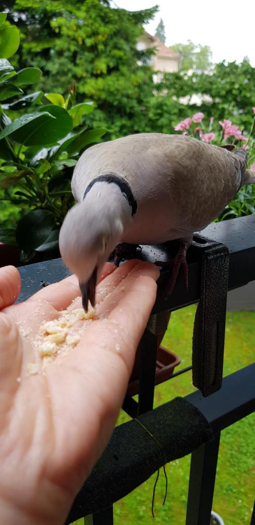 Pachtou,pas farouche les tourterelles sur le balcon de Zou, impatientes d'avoir leur pitance sur "assiette"