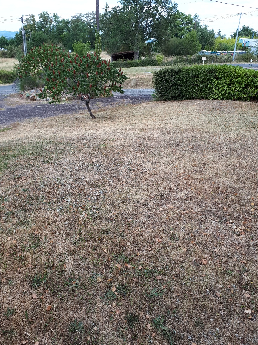 Coucou les amies! Ah!! ce matin un petit 16° que ça fait du bien, comme toi NOUCHE, j'ai relevé la couverture vers 4h du mat'. Ici aussi hier très chaud, un ciel chargé de gros nuages noirs mais un vent très fort par moment, qui les a poussés plus loin résultat : pas une goutte de pluie, ci-joint ma pelouse ou devrais-je dire mon paillasson Ce matin le ciel est chargé mais la météo hier soir ne nous annonçait pas de pluie.... Je vais profiter de cette fraicheur pour faire mes vitres. sinon pas grand chose à raconter, je reviendrai plus tard vous lire. Bises