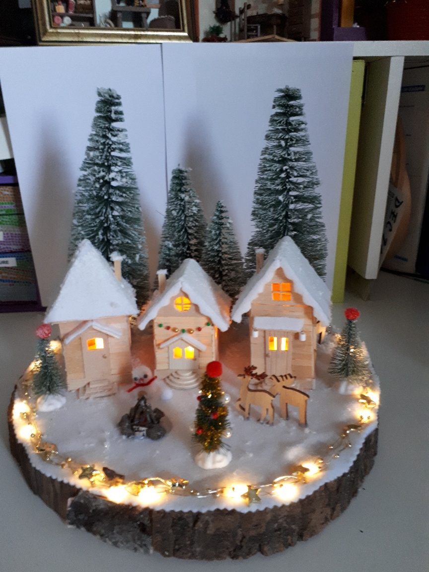 Coucou les amies! un ti-mot en vitesse, l'infirmière vient de repartir, pas folichon ce matin: 9,7 Voici le travail de samedi, Delphine a tout fait, à part les sapins et le cerf, l'élan, je lui ai juste aidé à équilibrer le tout .Une superbe après-midi Ce matin, vent froid et gris, parti le beau soleil d'hier, on a heureusement pu faire une tite balade, oh pas trop loin. Le téléphone sonne, bon à plus tard pour vous lire, bon appétit,