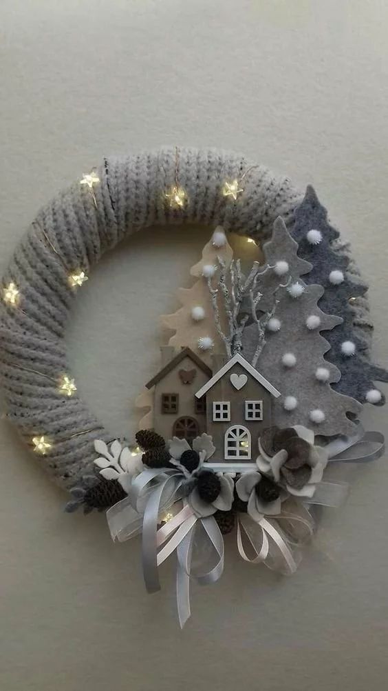 Coucou les amies! désolée pas venue hier, le matin , j'ai prospecté côté Est, pour trouver une couronne en polystyrène que Delphine va décorer demain, rien trouvé MARTINE, petit soucis avec le site, ça m'est arrivée souvent, la dernière fois je suis allée rechercher le site sur internet, et j'ai supprimé celui que j'avais dans mes favoris, ça a marché,??? mystère de l'informatique...... Ce matin, grand vent, de Nord/Est, bbbrrr! je n'ai pas à sortir tant mieux..Je vais ranger un peu l'atelier car pagaillou, pagaillou, il n'y a plus de place sur la table de travail, PAT chez nous aussi, les feuilles ne sont pas toutes tombées.Michel avait balayé les terrasses, plus qu'à recommencer, je lui ai bien dit d'attendre que toutes les feuilles soient tombées, mais bon ça l'occupe, ce n'est pas trop fatiguant.. NOUCHE bien occupée avec la crêche, tu as de l'aide, elle doit se régaler cette petite MANA pas trop de mal pour aller répéter? la route est dégagée? j'ai vu qu'ils annonçaient de la neige en grande quantité..... Bon je vais aller boire un ti café et je me lance dans le rangement, et repasser, il y en a peu ce sera vite fait ,et que tout soit prêt pour demain Bonne journée à vous toutes, un ti coucou à celles que je n'ai pas nommées, bises à vous toutes! Voici le projet pour demain, Delphine s'est occupée de faire les petites maisons, dans la semaine. ce sera un cadeau pour mon neveu qui nous reçoit pour Noël, il pend la crémaillère.