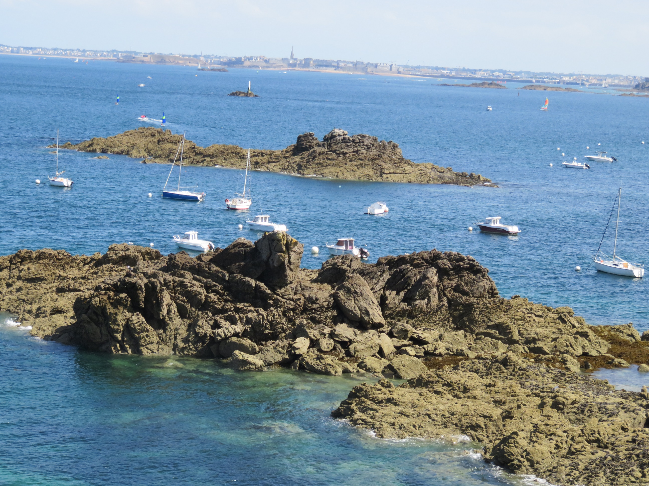 Bonjour à toutes, Bien dormi et au moins dans le noir, car les 3 derniers jours de voyage....lumière dans la chambre pour que les bestioles évitent de sortir !.....et il aurait presque fallu que la terre s'arrête de tourner !!!! NOUCHE effectivement pas de pluie, pas sorti le pépin, seulement le ciré à cause du vent. Congel à nouveau plein pour l'hiver, et en plus de la place libérée....on ne se fait pas de souci tu trouveras vite de quoi combler les trous DIDINE oui nous avons bien marché, grimpé, descendu ; Cependant pas d'omelette Mère Poulard, et à Cancale nous n'avons pas déjeuné chez Rollinger....en revanche nous avons déjeuné un midi au casino de Val andré, en bordure de plage, et c'était délicieux. MARTINE petite balade entre fille pendant que papy travaille au jardin, un bon moment. MANA nous avons fait connaissance d'un couple très sympa, dont la dame te ressemblait : même cheveux, taille....la 1ère fois j'ai cru que j'avais une hallucination...Tu es très mimi. A plus tard les Minettes, je dois aller en courses. (petit aperçu de la mer et du ciel) |