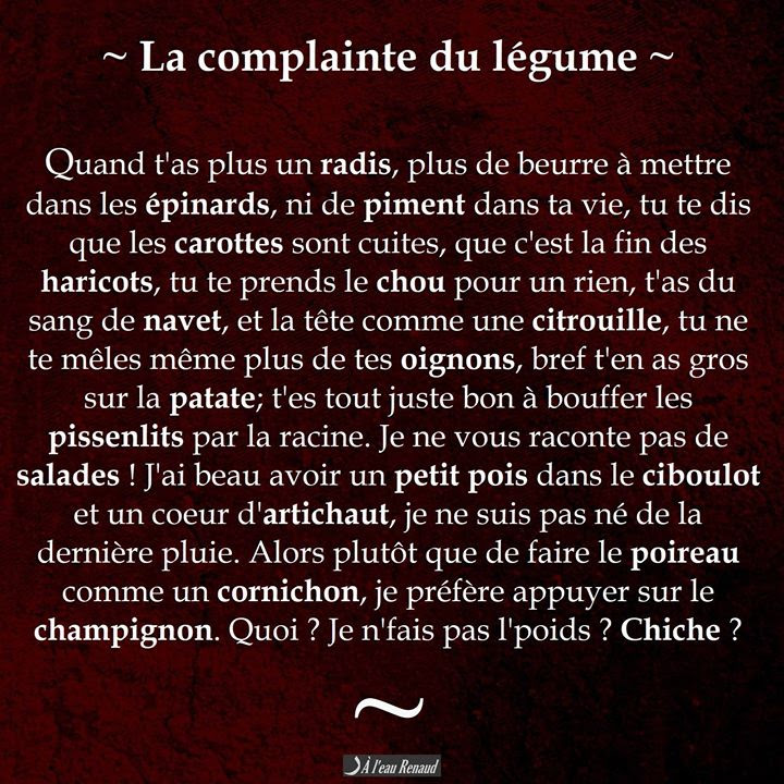 Nouche J'aime bien ta complainte des légumes. Notre intention est de venir à Pont St Vincent (chez nos amis du vol à voile) mais tu connais, les projets peuvent vite tomber à l'eau. Notre chorale a aussi l'intention de venir à Nancy, là aussi, cela risque fort de tomber à l'eau. C'est le temps de l'incertitude... |