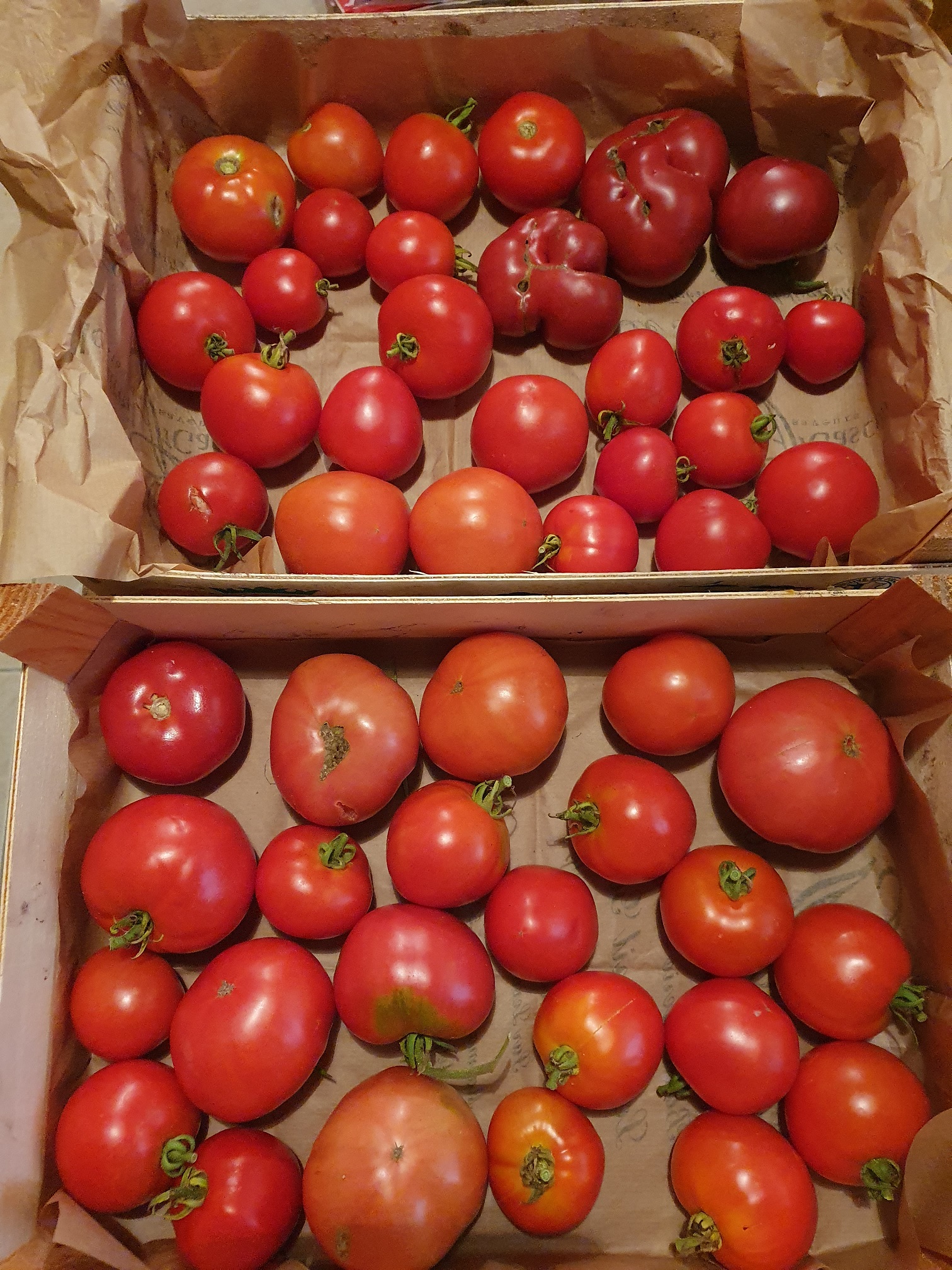 Bonjour. mana j'irais bien flâner dans les jardins... ici enfin une lueur d'espoir: Mon mari a menacé de prendre un avocat pour que les travaux se terminent... Le gars a enfin téléphoné et l'après midi même il a contacté son plombier et la grosse fuite est colmatée l'eau remise!C'était justement à ce moment-là que Karim devait venir nous présenter sa jolie trottinette à 2500€ On s'est juste croisés dans l'allée et il est resté bavarder avec son aîné Arnauld. Enfin on va pouvoir passer du temps à Chailles car jusqu'ici on y allait pour nourrir les chats et aérer.Quant aux travaux ils sont reportés après les congés (ça devait être fait cette semaine..;) Arnauld partira dimanche matin.Il n'est pas encore vacciné mais il a ses 2 dates.J'ai l'impression de passer les 3/4 de mon temps devant les fournaux ou à y réfléchir. Belles tomates pour nous ce sera 1 petite tomate qui finit de mûrir avec ses copines du marché. L'heure du café arrive...Bonne journée. |