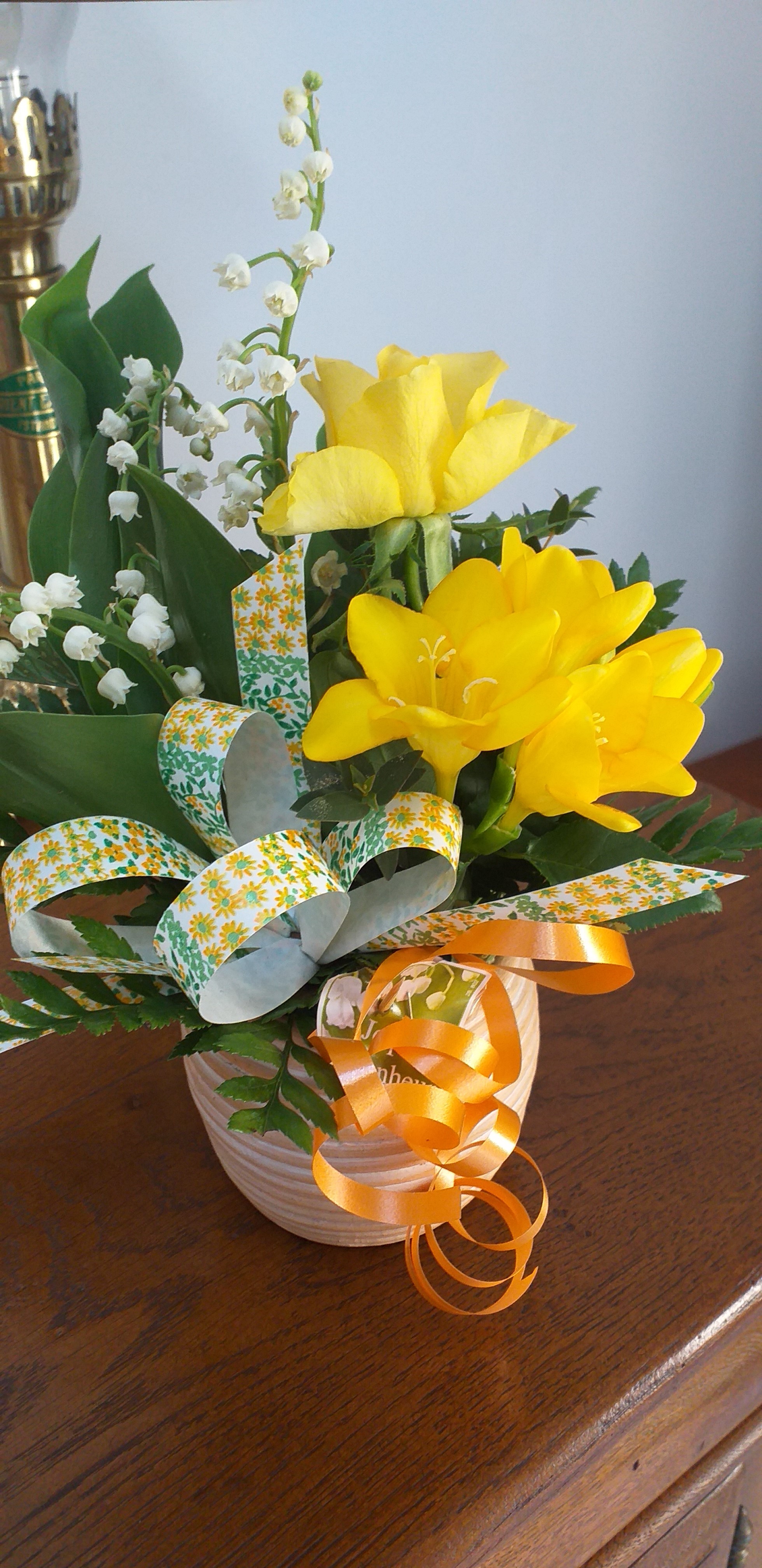 coucou les maminettes me voila le soleil brille pour l'instant malgre les nuages gris qui se profilent il n'a pas gelé tout juste un petit 1° ;bon samedi hier ça y est mon aspi est campé c'est vrai qu'il faut toujours rusé car mon robert aurait voulu le faire mais pendant plusieurs jours je l'aurais entendue gemir mais mon neveu le connait il est tres diplomate il a demande a robert de l'aider comme cela tout le monde est content ;les filles elles ont ete faire de la marche dans les bois mais vu seulement les feuilles et point de muguet ,la tourte aux grenouilles a bien plue crudités et melon en entrée et fraises en dessert je n'ai pas fait la tarte mirabelles ce sera pour ce jour ;enfin hier coup de fil de mon CHARLY il vient le 8 mai et a réussi a poser le reste de ses vacances donc il passera 8 jours chez nous ..........enfin presque car copains et amis l'attende egalement enfin je vais pouvoir le gater un peu il commençait a en avoir marre tout seul dans son appart' il a bien des collegues avec qui il sortait beaucoup au rugby mais presque tous habitent a plus de 10kms donc apres sa semaine du boulot ou il les voit il se retrouve seul dans son canapé a jouer avec sa tablette et a cuisiner..........ce qui n'arrange rien a sa ligne et son diabète ce jour je vais faire du lapin avec haricots vert et en entrée tomates farcies au thon là on est que 3 mais bon mes 2 convives ont un bon coup de fourchette bonne journée a vous toutes gros bisous et a+++ ci joint la photo du muguet que notre christine nous avait apporte il y a 2 ans avec le covid l'an passé on a eut qu'une photo confinement oblige |