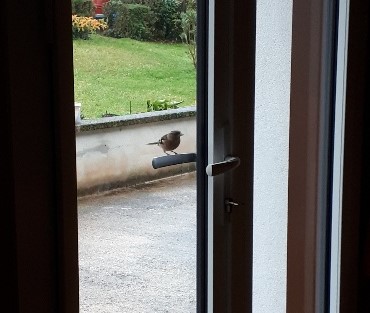 Re-coucou! regardez qui vient me cogner au carreau et surtout crotter sur mon seuil très souvent 😕 on rit avec Michel un pivert dans la pelouse grignotait un ver de terre et Mr pinson des arbres sur la poignée, on avait aperçu un très long ver de terre juste avant, traversant la terrasse , j'ai dit à Michel , il ne va pas aller loin, ça n'a pas loupé, je crois que Mr pivert en a fait son repas..... c'est beau la campagne, hein? 🥰 c'est bien joli d'admirer la nature mais il faudrait que j'avance un peu, je viens de finir mon brushing, je me retrouve avec un carré, au niveau du lobe de l'oreille, très facile à coiffer car ils en ont l'habitude, depuis toute jeune j'ai eu un carré plus ou moins long, avec mes cheveux très fins il n'y avait guère que cette coupe qui m'allait. Je n'ai pas fait appel à Mag ma nièce coiffeuse, elle ne veut pas courir le risque de me contaminer. Je verrai un peu plus tard de toute façon, on ne sort pas , et puis ça me tient chaud aux oreilles... 😂