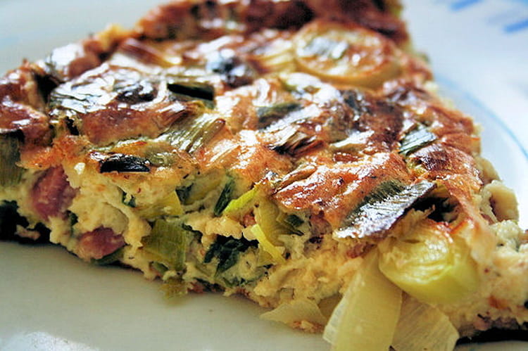3 Ajoutez à votre préparation les lardons et les poireaux et mélangez bien. Versez le tout dans un moule beurré et tapissé de chapelure. Le plat est de préférence rond d'environ 25 cm de diamètre.