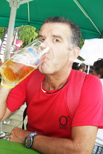 Pour le vélo, chaque coup de pédale devrait etre multiplié par 2 puisque j'ai 2 jambes ( lol ) mais qu'un seul fitbug !!! Aussi, on fait environ 5 m en vélo 'un coup de pédale , et à Roth il y a 180 km à faire ce qui devrait donner dans une "logique" de pas : 180000 :5 = 36000 x 2 = 72000 + 53000 course = 125000 pas faits sur la totalité, et là mon défi est gagné largement ! Mais bon, on écrit les règles avant l'épreuve et pas après, n'est ce pas ? L'heure du réconfort est venue, une bonne bière pour la récupération, c'est le top !! |