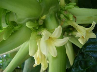 Fleurs du papayer femelle. Le papayer mâle à des grappes fleuries qui ne se transforment jamais. Je vous mettrai une photo dès que j'en ferai une. |