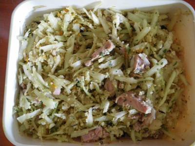 Une salde de papaye verte, radis noir, thon et semoule de couscous agrémenté de curcuma frais de persil, d'un petit mélange d'huile olive et colza et de vianigre balsamique et de vin. |