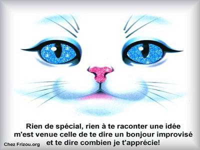 Bonjour mes gazelles, bonjour mes amies, J'espère que ma peinture sera dans le bons sens, dernière toile Comment allez vous ? Un samedi de passé, je vous souhaite un bon dimanche et lundi, un week end plus long que d'habitude........... Je fais la fainéante, et je suis impardonnable de ne pas venir plus souvent vous lire, ce n'est pas pour cela que je vous oublie. Personnellement rien de particulier, mon fils n'a toujours rien trouvé, les employeurs ne "daignent" même pas répondre. Le temps c'est rafraichi, on supporte la petite laine hihi Il se fait tard, je vais donc allez dans les bras de Morphée Bonne journée, mes plus tendres bisous |
