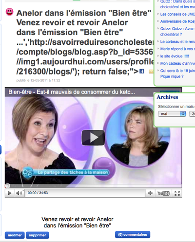 Hmm, testé de mon coté et ca fonctionne ! http://www.savoirreduiresoncholesterol.com/compte/blogs/blog.asp?rno=358759&b_id=26428 Il faut que tu rentres ce code : <iframe width="560" height="349" src="http://www.youtube.com/embed/txtNQyEV_1M" frameborder="0" allowfullscreen></iframe> dans l'espace dédié "ajouter une vidéo" |