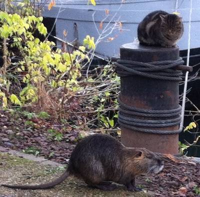 Samedi, je me suis promenée au bord de Seine comme d'hab. et j'ai vu ça. Je n'ai pu m'empêcher de prendre une photo. Le ragondin et le chat...Qui le regarde... Imperturbable. |