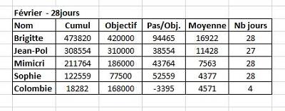 Mimi que tu es courageuse... mais pense à te préserver un peu.... je sais c''st facile à dire....je souhaite que tout aille au mieux pour ton époux, et que tes problèmes administratifs soient résolus une bonne fois pour toute. Jean-Pol.... il me manque tes pas de samedi 28/02... (mais tu étais encore sur la route....) je vois que tu n'as pas le temps de t'ennuyer.... toujours sur les quatre chemins..... !!! aux quatre coins de l'hexagone.... !!! Donc voici le récapitulatif pour ce mois de février..... tout en sachant qu'il me manque une grande partie des nombre de pas de Colombie.... mais je crois savoir que son podomètre est HS...!!! Alors maintenant, j'attends vos objectifs pour ce mois de mars..... Bises à tous.... |