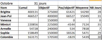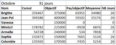 Il manque 3 jours à Brigitte qui a été pessimiste et a atteint son ancien objectif, J'attend vos derniers résultats pour valider ce mois d'octobre, n'oublier pas de me donner vos nouveaux objectifs sinon je pars sur un mix résultats/objectif.
