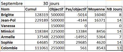 Il manque la moitié des résultats mais je publie les résultats de la semaine dernière pour essayer de motiver les absentes Mimi et Sophie, bravo vous êtes en avances sur vos objectifs. Quant à moi je suis en retard et je pense que j'aurai bien du mal à dépasser les 450 000 pas ce mois-ci. |