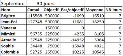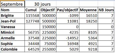 Voici le premier tableau provisoire de septembre, il me manque les 1 et 2 septembre pour Colombie, merci de valider vos objectifs. A noter Sophie n'est pas loin d'un moyenne de 5000 pas par jour |