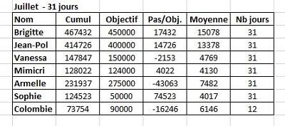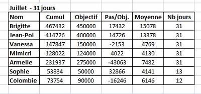Bonjour à tous, Je vois que certains ont fait des exploits.... donc voici le tableau du mois de juillet... mais il me manque le 31/07 pour Mimicri et 14 au 31/07 pour Sophie/Cygne. Un grand bravo à tous. Objectifs atteint pour Jean-Paul, Vanessa, Mimicri et moi, Un peu de retard pour Armelle et Colombie (venue nous rejoindre en cours de mois) mais ce n'est que partie remise pour le mois prochain. Si pas de nouvelles de vous... c'est que vous gardez le même objectif que le mois précédent. PS; : Sophie.... j'attends tes chiffres.... Bises à tous et bon week end. |