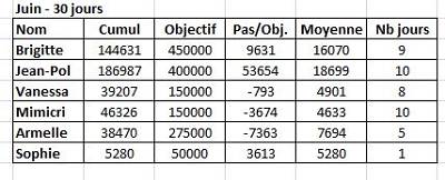 Bonsoir à tous, il me manque quelques chiffres pour afficher le tableau de la 1ère semaine de juin du 1er au 8/06. Sophie du 02 au 08/06 Armelle les 6, 7 et 8/06 Jean-Pol le dimanche 08/06. Merci à tous et bonne semaine de marche.