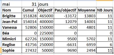 Mimi, il manque la journée du 7, Relise il manque 5 jours, Bea ne semble pas avoir réglé son pb de podo. Sinon voici vos résultats au tiers du parcours |