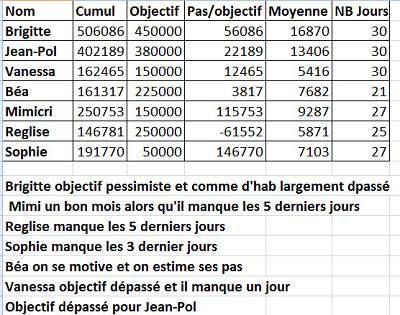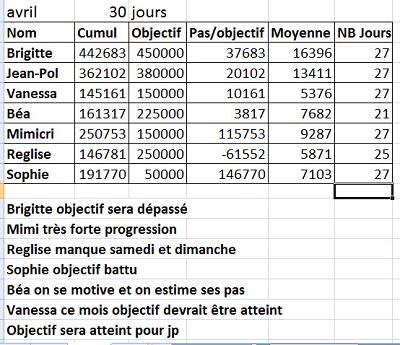 Un grand bravo à Sophie qui a multiplié son objectif par presque 4 Bravo à Vanessa qui s'est motivée tout le mois pour dépasser son objectif Mimi en comptabilisant tes pas pendant 27 jours j'arrivai à 250 753 pas donc tu mimimises tes pas. Je prend en compte tes 206 558 pas déclarés dans ton dernier post dans le tableau mais vérifie tu as fait mieux. Brigitte est toujours classée dans les hypers actives et reste comme d'hab au dessus des 500 000 pas avec mes petits 400 000 j'ai du mal à la suivre. Béa je sens une toute petite baisse de motivation, courage et tout va bien se passer. Demande à quelqu'un de t'aider à vérifier to podo si tu s un doute. Reglise on se reprend et le mois de Mai va faire exploser ton podo. |