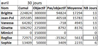 Voici le tableau à mi avril, Mimi semble nous avoir abandonné. Sniff Sophie n'a pas encore donné ses résultats de la semaine. Je vous laisse commenter vos résultats |